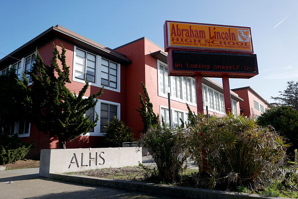 SAN FRANCISCO, CALIFORNIA - DECEMBER 17: A sign is posted outside of Abraham Lincoln High School on December 17, 2020 in San Francisco, California. A San Francisco school names advisory committee is recommending to remove Abraham Lincoln’s name from San Francisco's Abraham Lincoln High School for the 16th President's past treatment of Native Americans. The committee is recommending the renaming of 44 schools named after historical figures that they find inappropriate. (Photo by Justin Sullivan/Getty Images)