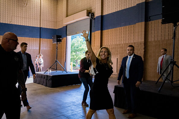 DALTON, GA - MAY 27: U.S. Rep. Marjorie Taylor Greene (R-GA) arrives to speak at an America First Rally also attended by Rep. Matt Gaetz (R-FL) on May 27, 2021 in Dalton, Georgia. The two Republicans, among the most outspoken supporters of former President Donald Trump, are co-hosting a cross-country series of rallies. (Photo by Megan Varner/Getty Images)
