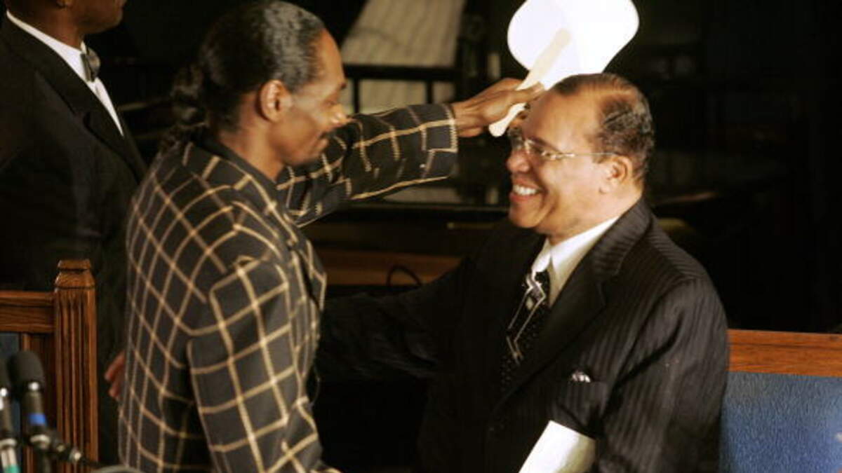 Los Angeles, UNITED STATES: US rapper Snoop Dogg hugs Nation of Islam leader Louis Farrakhan during the funeral of Stanley "Tookie" Williams in a church in Los Angeles 20 December 2005. Williams, the founder of the South Central Los Angeles Crips gang was excecuted 13 December after Governor Arnold Schwarzenegger denied him clemency. Anti-death penalty activists claimed that Williams, a Nobel Prize nominee, had been wrongfully accused of four shotgun murders. AFP PHOTO/Hector MATA (Photo credit should read HECTOR MATA/AFP/Getty Images)