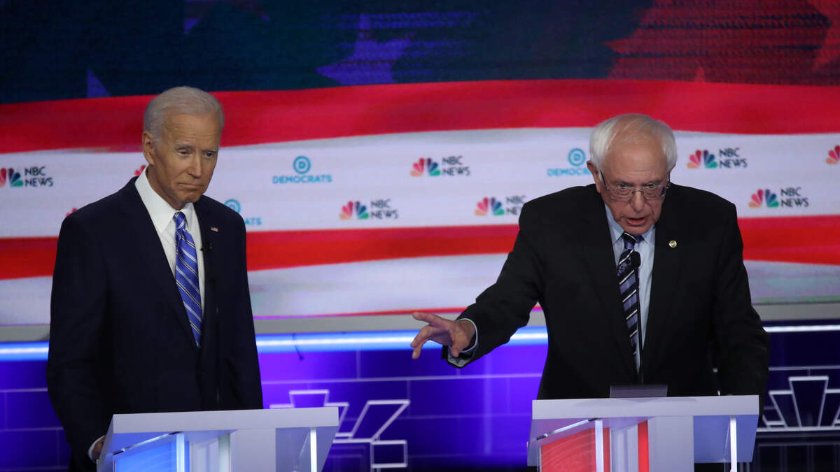 MIAMI, FLORIDA - JUNE 27: Democratic presidential candidate former Vice President Joe Biden looks on as Sen. Bernie Sanders (I-VT) speaks during the second night of the first Democratic presidential debate on June 27, 2019 in Miami, Florida. A field of 20 Democratic presidential candidates was split into two groups of 10 for the first debate of the 2020 election, taking place over two nights at Knight Concert Hall of the Adrienne Arsht Center for the Performing Arts of Miami-Dade County, hosted by NBC News, MSNBC, and Telemundo. (Photo by Drew Angerer/Getty Images)