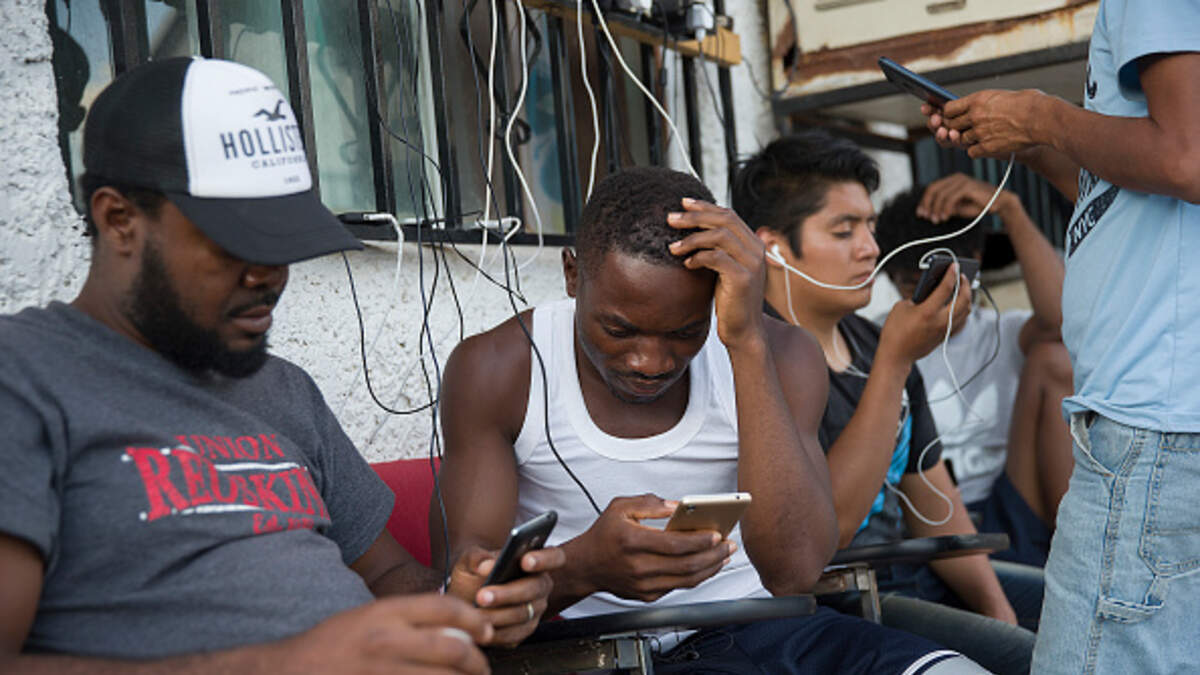 CIUDAD JUAREZ, MEXICO - JUNE 05: Migrants from Cameroon use their cell phones as they relax at the Albergue Para Migrantes El Buen Samaritano while waiting to have their number on a waiting list that is months long to be called to have an initial interview with an United States asylum officer on June 05, 2019 in Ciudad Juarez, Mexico. For the third month in a row, detentions along the United States border topped 100,000 people. (Photo by Joe Raedle/Getty Images)