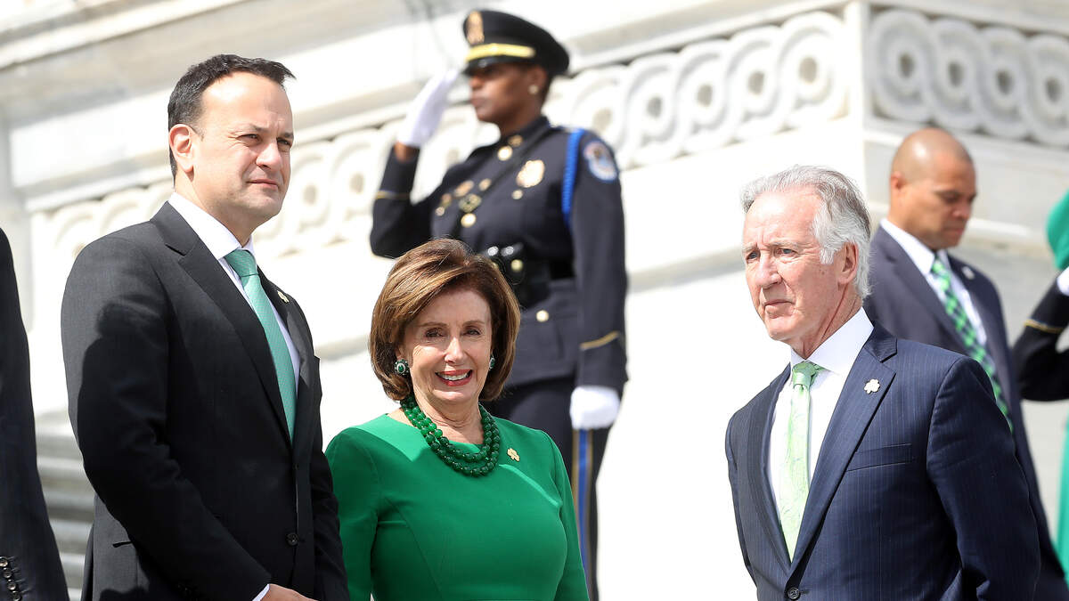 WASHINGTON, DC - MARCH 12: U.S. House Speaker Nancy Pelosi (D-CA), Irish Taoiseach Leo Varadkar (L) and Rep. Richard Neal (D-MA) (R) walk out of the U.S. Capitol after the annual Friends of Ireland luncheon at the Rayburn Room of U.S. Capitol March 12, 2020 in Washington, DC. (Photo by Mark Wilson/Getty Images)