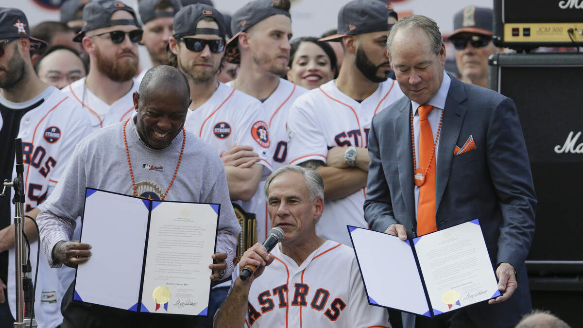 HOUSTON, TX - NOVEMBER 03: Texas Governor Greg Abbott presents Houston Mayor Sylvester Turner and Houston Astros Owner Jim Crane a Houston Astros Day Proclamation during the Houston Astros Victory Parade on November 3, 2017 in Houston, Texas. The Astros defeated the Los Angeles Dodgers 5-1 in Game 7 to win the 2017 World Series. (Photo by Tim Warner/Getty Images)