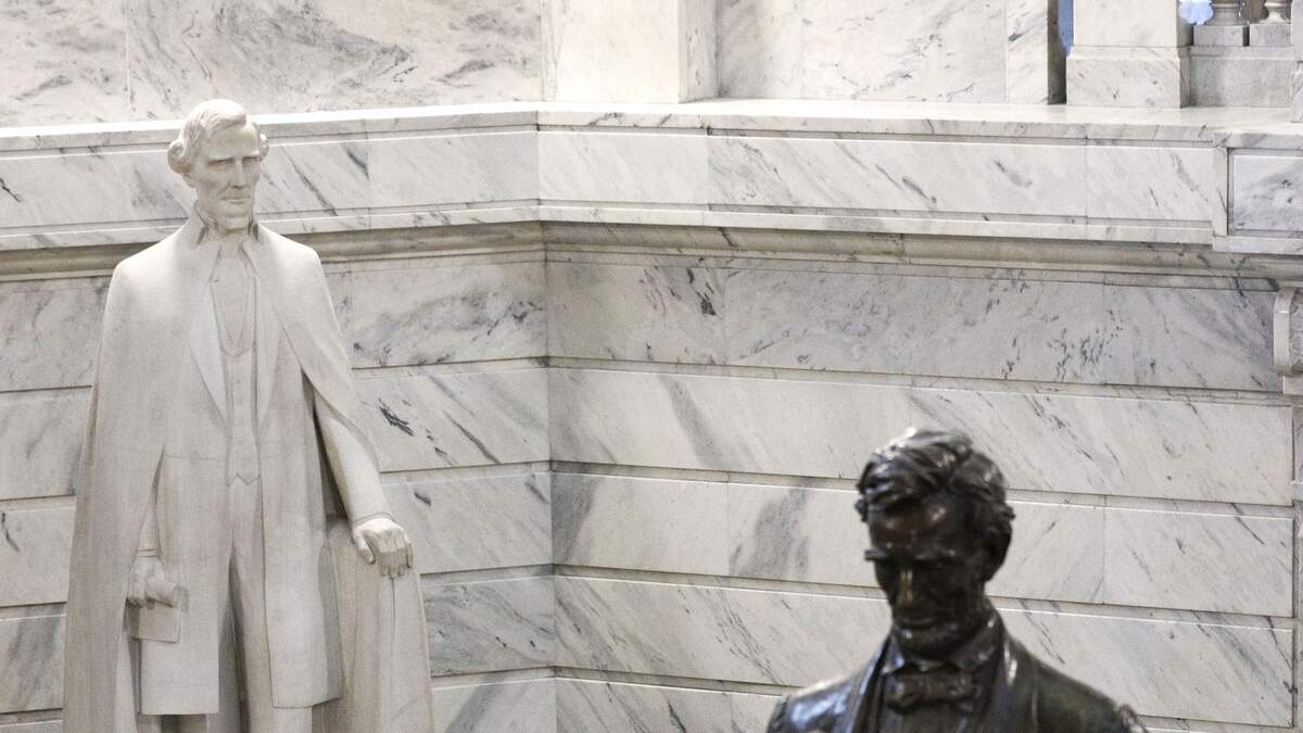 FRANKFORT, KY - AUGUST 30: A statue of Confederate President Jefferson Davis (left) stands near a statue of President Abraham Lincoln in the rotunda of the Kentucky State Capitol building August 30, 2017 in Frankfort, Kentucky. African-American groups held a rally there today to urge Kentucky Governor Matt Bevin to remove the statue of Davis. (Photo by Bill Pugliano/Getty Images)
