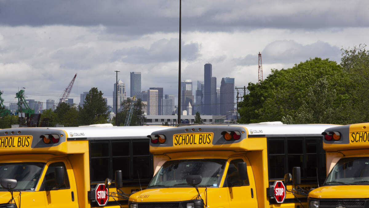 SEATTLE, WA - MAY 06: School buses sit idle in a bus yard on May 6, 2020 in Seattle, Washington. Since the outbreak of COVID-19 and the closure of all school buildings, the Seattle Public Schools Nutrition Services Department has been distributing breakfast and lunch to students through a network of 26 school sites and 43 bus routes five days a week. The meal distribution also includes additional food for weekends. Approximately 6,500 people are served per day through the program. (Photo by Karen Ducey/Getty Images)