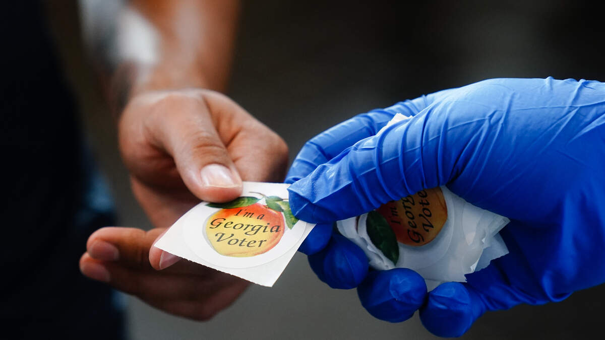 ATLANTA, GA - JUNE 09: A man recieves an "I'm a Georgia Voter" sticker after casting a ballot in Georgia's Primary Election on June 9, 2020 in Atlanta, Georgia. Voters in Georgia, West Virginia, South Carolina, North Dakota, and Nevada are holding primaries amid the coronavirus pandemic. (Photo by Elijah Nouvelage/Getty Images)