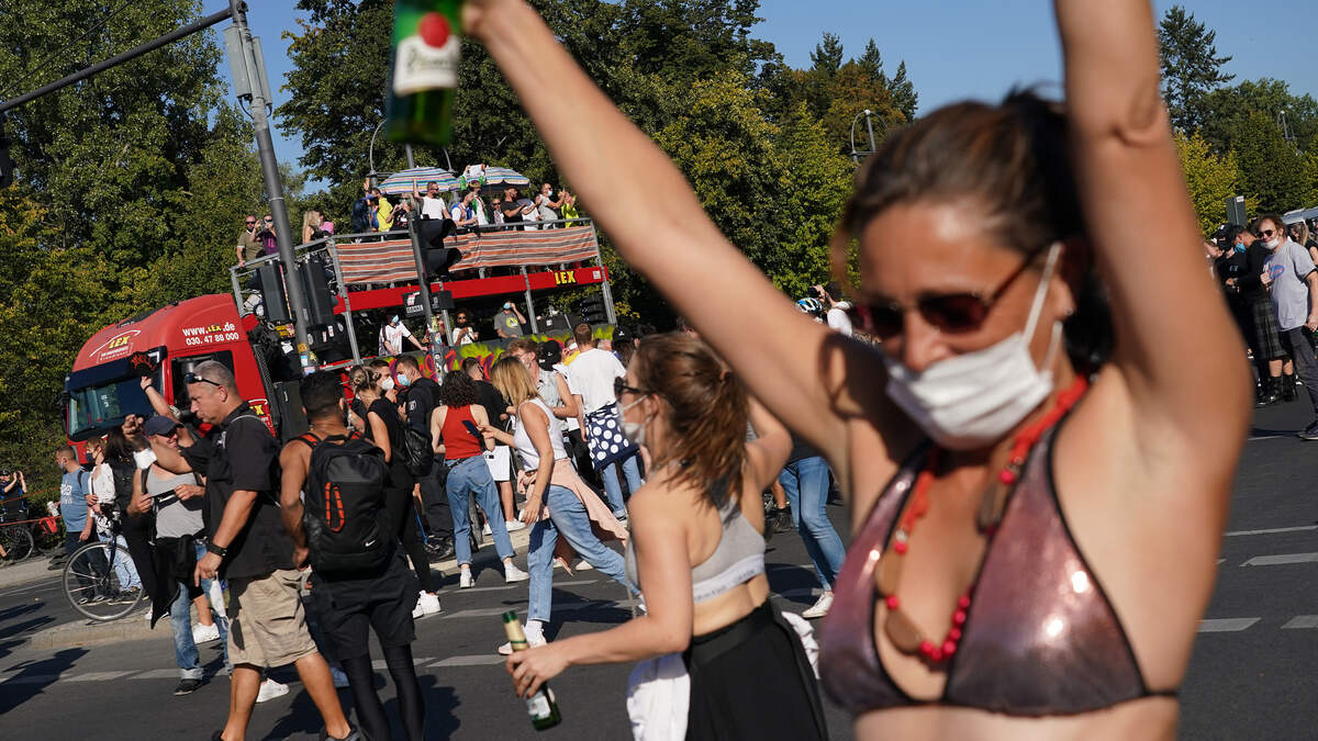 BERLIN, GERMANY - SEPTEMBER 21: Clubbing enthusiasts dance to techno music during the "Love World Peace Parade" on September 21, 2020 in Berlin, Germany. Several hundred participants, most wearing face masks, danced while accompanied by two party trucks in the city center at an event meant to be reminiscent of the Love Parade. (Photo by Sean Gallup/Getty Images)