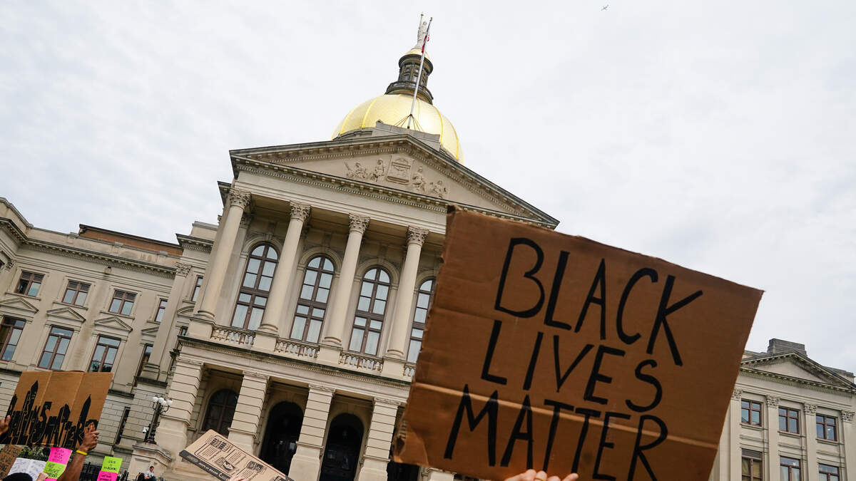 ATLANTA, GA - JUNE 06: People gather outside the Georgia State Capitol during a protest against police brutality on June 6, 2020 in Atlanta, Georgia. This is the 12th day of protests since George Floyd died in Minneapolis police custody on May 25. (Photo by Elijah Nouvelage/Getty Images)