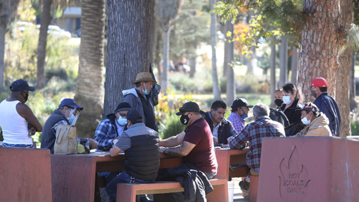 People wearing protective masks play cards in Echo Park in Los Angeles, California, U.S., on Monday, Nov. 30, 2020. The city imposed another stay-home order starting Monday and lasting for three weeks, saying that the measures are less stringent than those issued in March despite a sudden case surge because face-wearing and social distancing have proven effective. Photographer: David Swanson/Bloomberg via Getty Images