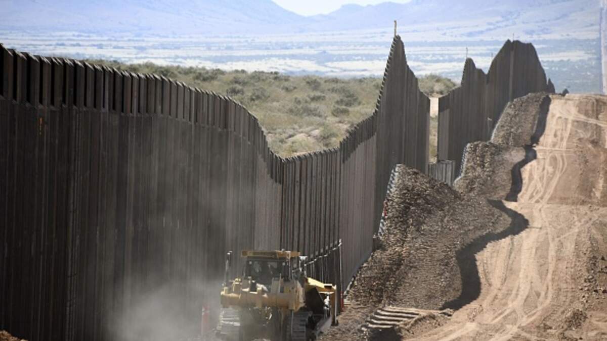 Construction work is under way near Naco, Arizona, on Oct. 6, 2020, to build a border wall between the United States and Mexico. (Photo by Kyodo News via Getty Images)