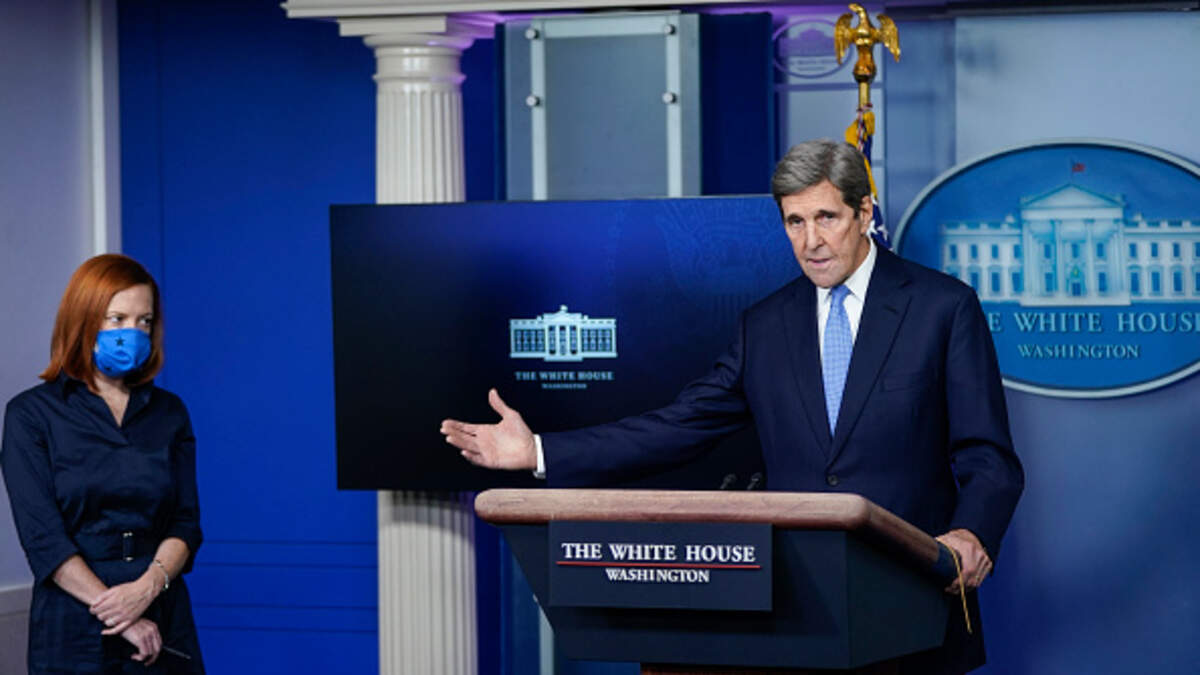 WASHINGTON, DC - JANUARY 27: (L-R) White House Press Secretary Jen Psaki looks on as Special Presidential Envoy for Climate John Kerry speaks during a press briefing at the White House on January 27, 2021 in Washington, DC. Kerry and McCarthy took questions from reporters about the Biden administration's plans and agenda on climate change issues. (Photo by Drew Angerer/Getty Images)