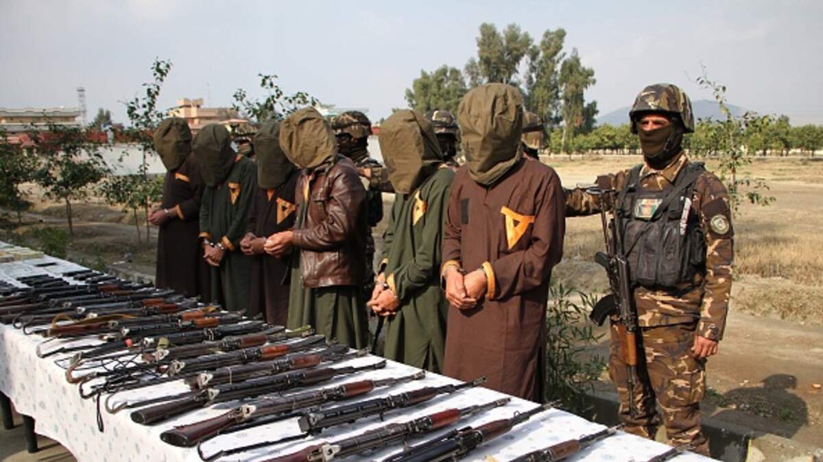 Afghanistan's National Directorate Security (NDS) escort a group of suspected militants who are accused of planning attacks on government and security forces after their arrest in Jalalabad, Afghanistan on January 23, 2019. Afghan security forces have detained six alleged Taliban militants and seized a suicide vest and ammunition during an operation in Ghani Khil district of Nangarhar province, an official said.(Photo by Wali Sabawoon/ Nurphoto) (Photo by Wali Sabawoon/NurPhoto via Getty Images)