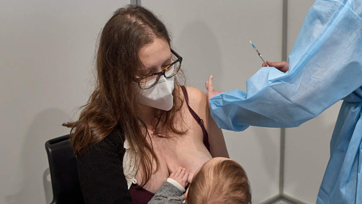 ALCABIDECHE, PORTUGAL - FEBRUARY 10: Dr. Sofia Silva breastfeeds her 6-month baby while receiving the first dose of the vaccine on the day the health personnel and people belonging to the first group in line for immunity are being inoculated with the Pfizer-BioNTech vaccine at the vaccination center opened by Cascais Municipality in the Alcabideche Sports Complex during the COVID-19 Coronavirus pandemic on February 10, 2021 in Alcabideche, Portugal. Henrique de Barros, from the Public Health Institute of the University of Porto, said on February 09 at INFARMED meeting Lisbon that if it is assumed that “70% of the Portuguese population will be vaccinated by the end of September, we can expect to leave the current situation at the end of Summer”. Portugal has suffered so far a confirmed total of infections of 770.502 and 14.557 deaths since the beginning of the pandemic. (Photo by Horacio Villalobos#Corbis/Corbis via Getty Images)