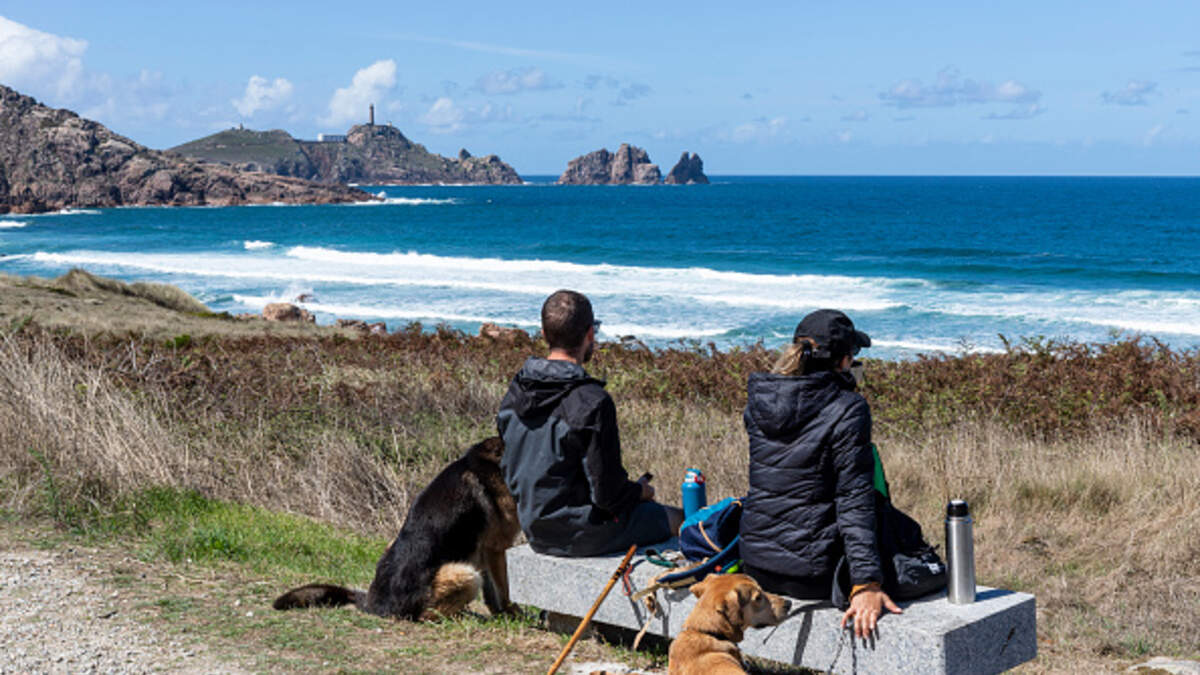 CAMARIÑAS, SPAIN - AUGUST 30: A couple of young hikers rest with their dogs and contemplate the lighthouse of Cape Vilan, in the region of Costa da Morte, seen on August 30, 2020 in Camariñas, Galicia, Spain. (Photo by Xurxo Lobato/Getty Images)