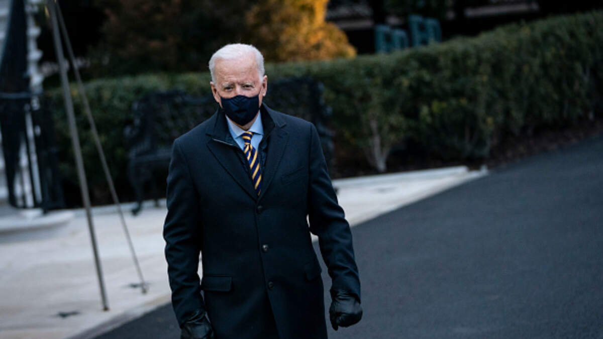 WASHINGTON, DC - FEBRUARY 16: U.S. President Joe Biden walks toward reporters on his way to Marine One on the South Lawn of the White House on February 16, 2021 in Washington, DC. President Biden is traveling to Milwaukee, Wisconsin for a town hall event to discuss the coronavirus pandemic and a $1.9 trillion relief bill he is trying to pass through Congress. (Photo by Drew Angerer/Getty Images)
