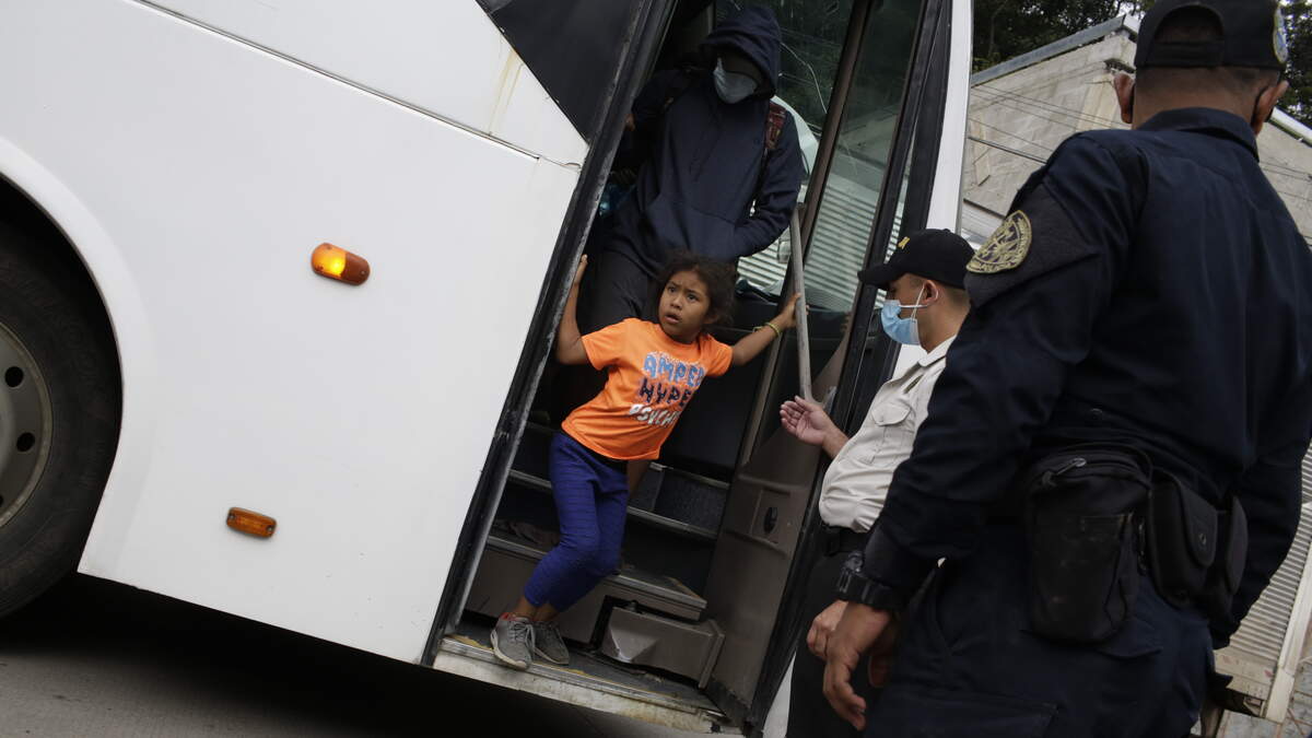 EL FLORIDO, GUATEMALA - JANUARY 18: A girl gets off a bus that takes them back to the Honduran border with Guatemala on January 18, 2021 in El Florido, Guatemala. The caravan departed from Honduras to walk across Guatemala and Mexico to eventually reach the United States. After clashing with the police yesterday migrants are being held to carry out immigration and heath controls. Central Americans expect to receive asylum and most Hondurans decided to migrate after being hit by recent hurricanes. (Photo by Josue Decavele/Getty Images)