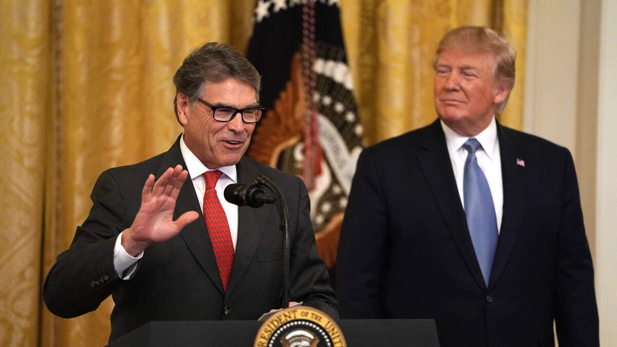 WASHINGTON, DC - JULY 08: U.S. Secretary of Energy Rick Perry (L) speaks as President Donald Trump (R) looks on during an East Room event on the environment July 7, 2019 at the White House in Washington, DC. President Trump delivered remarks on “his Administration’s environmental accomplishments of cleaner air and cleaner water, including helping communities across the Nation reduce air pollution and meet our air quality standards, as well as modernize outdated infrastructure and improve water quality while at the same time growing a strong economy for all Americans.” (Photo by Alex Wong/Getty Images)