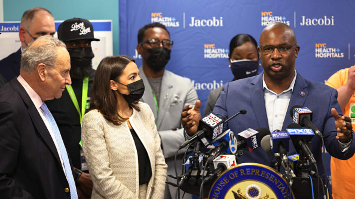 NEW YORK, NEW YORK - JUNE 03: Rep. Jamaal Bowman (D-NY) answers a question during a press conference at Jacobi Hospital in the Morris Park neighborhood on June 03, 2021 in the Bronx borough of New York City. Senate Majority Leader Chuck Schumer (D-NY), joined by Rep. Alexandria Ocasio-Cortez (D-NY) and Rep. Jamaal Bowman (D-NY), held a press conference urging Congress to provide $400,000 to Jacobi Hospital's Stand Up to Violence (SUV) Program, a youth violence reduction program, on the heels of a Memorial Day weekend that saw a total of nine shootings across NYC. One of the victims was a 15-year old Bronx resident. The program is modeled after Chicago's Cure Violence program that responds to shootings to help prevent retaliation and to assists family members of those who have been injured or killed. The money would allow Stand Up to Violence (SUV) Program to add an emergency room social worker, case worker, part time psychiatrist and a creative arts or music therapist. (Photo by Michael M. Santiago/Getty Images)