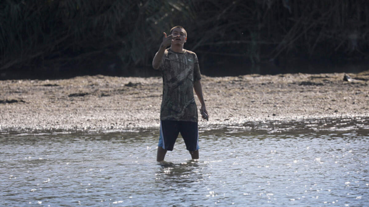 ROMA, TX - MARCH 14: (EDITORS NOTE: Image contains profanity.) A human smuggler expresses himself on the Mexican bank of the Rio Grande at the U.S.-Mexico border on March 14, 2017 in Roma, Texas. U.S. Border Patrol agents had intercepted his group of undocumented immigrants on the Texas side of the river and pushed him back into Mexico. (Photo by John Moore/Getty Images)