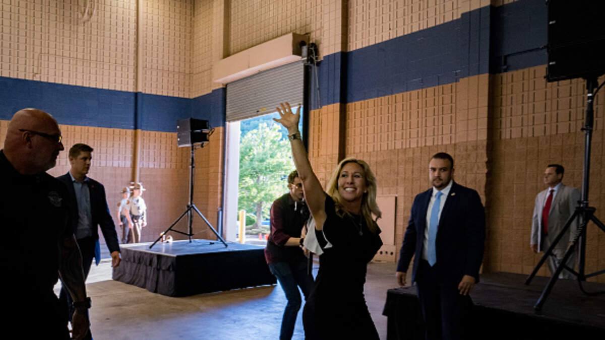 DALTON, GA - MAY 27: U.S. Rep. Marjorie Taylor Greene (R-GA) arrives to speak at an America First Rally also attended by Rep. Matt Gaetz (R-FL) on May 27, 2021 in Dalton, Georgia. The two Republicans, among the most outspoken supporters of former President Donald Trump, are co-hosting a cross-country series of rallies. (Photo by Megan Varner/Getty Images)