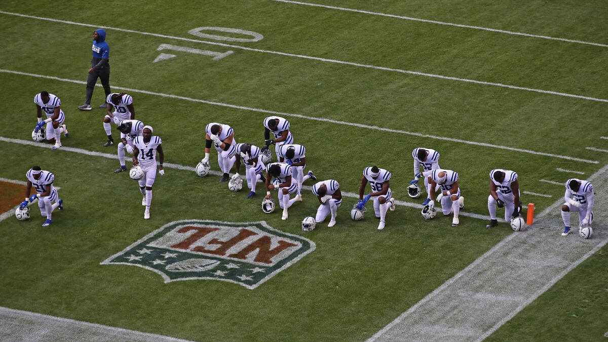 CHICAGO, ILLINOIS - OCTOBER 04: Members of the Indianapolis Colts take a knee before playing the Chicago Bears at Soldier Field on October 04, 2020 in Chicago, Illinois. (Photo by Jonathan Daniel/Getty Images)