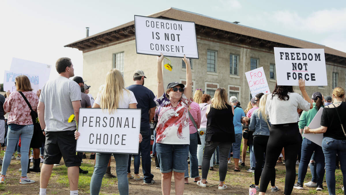 SAN DIEGO, CA - SEPTEMBER 28: Anti-vaccine protesters stage a protest outside of the San Diego Unified School District office to protest a forced vaccination mandate for students on September 28, 2021 in San Diego, California. The School District was holding a virtual hearing on whether to enact a mandate for students to recieve at least one dose of a COVID vaccine. (Photo by Sandy Huffaker/Getty Images)