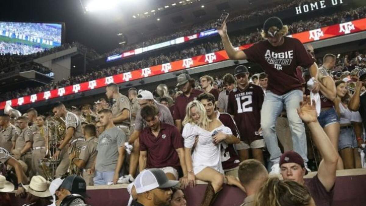 As A&M fans stormed the field to celebrate their team’s 41-38 victory over the #1 team in the land, the security detail for Alabama coach Nick Saban grabbed ahold of the coach and did their best to clear a path for the coach to get him into the tunnel. But, unfortunately, one A&M fan found herself caught between the coach and the tunnel and got trucked.