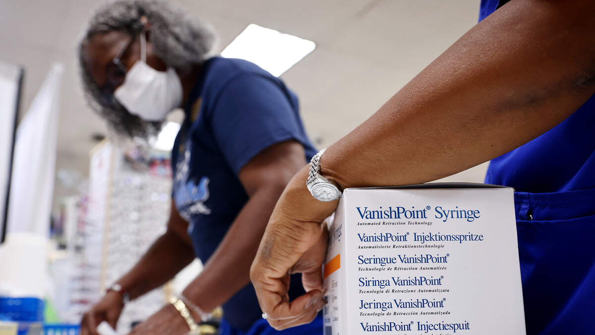 BATON ROUGE, LOUISIANA - AUGUST 17: Nurse Carla Brown (L) and co-worker Missy Hastings prepare to depart Bordelon's Pharmacy with vaccines to administer to residents in their homes on August 17, 2021 in Baton Rouge, Louisiana. Brown embarked on a personal mission to save lives and vaccinate members of underserved communities in Baton Rouge after her husband David died of COVID-19. Since March, she has helped vaccinate more than 2,000 people, many in their homes because they were elderly or did not have access to transportation. Brown and Hastings work as a team during the in-home visits where they also provide accurate vaccine information helping to dispel the fears of those who don’t trust the medical establishment. Louisiana holds one of the nation’s lowest vaccination rates with just 38 percent of its residents fully-vaccinated. COVID-19 hospitalizations hit a new daily record of more than 3,000 in the state today. (Photo by Mario Tama/Getty Images)