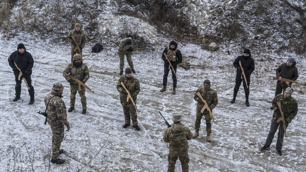 KYIV, UKRAINE - JANUARY 15: Members of the Kyiv Territorial Defense Unit are trained in an industrial area on January 15, 2022 in Kyiv, Ukraine. As worries of a Russian invasion have grown in recent months, more Ukrainians have been moved to join territorial defense groups, which aim to provide civilians with military skills and create a reservist army that would support regular forces in the event of an attack. (Photo by Brendan Hoffman/Getty Images)