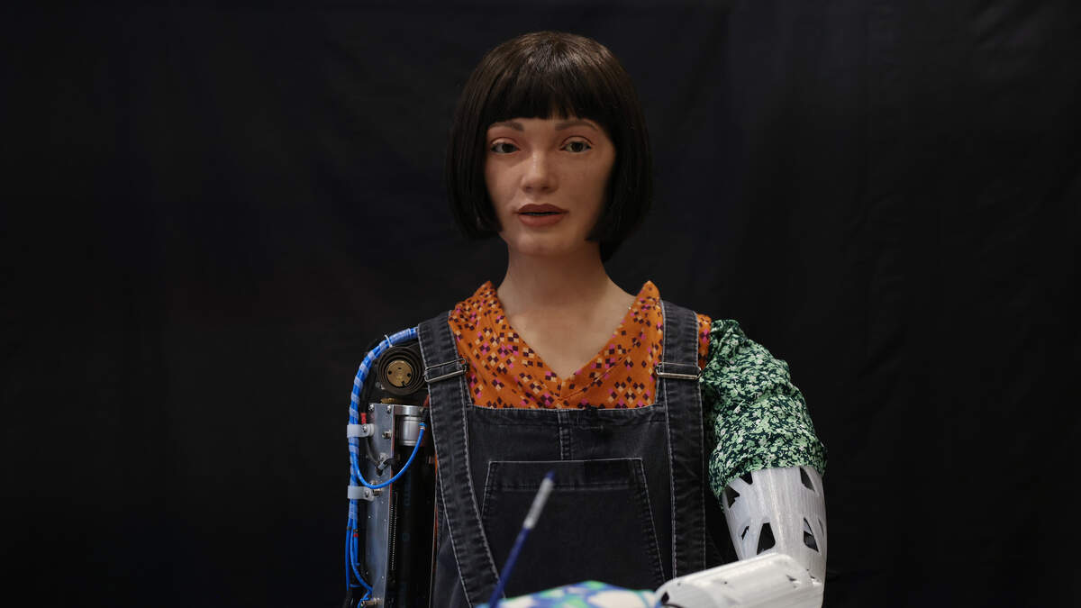 LONDON, ENGLAND - APRIL 04: Ai-Da Robot, an ultra-realistic humanoid robot artist, paints during a press call at The British Library on April 4, 2022 in London, England. Ai-Da will open her solo exhibition LEAPING INTO THE METAVERSE at the Venice Biennale this year curated by Aidan Meller. (Photo by Hollie Adams/Getty Images)